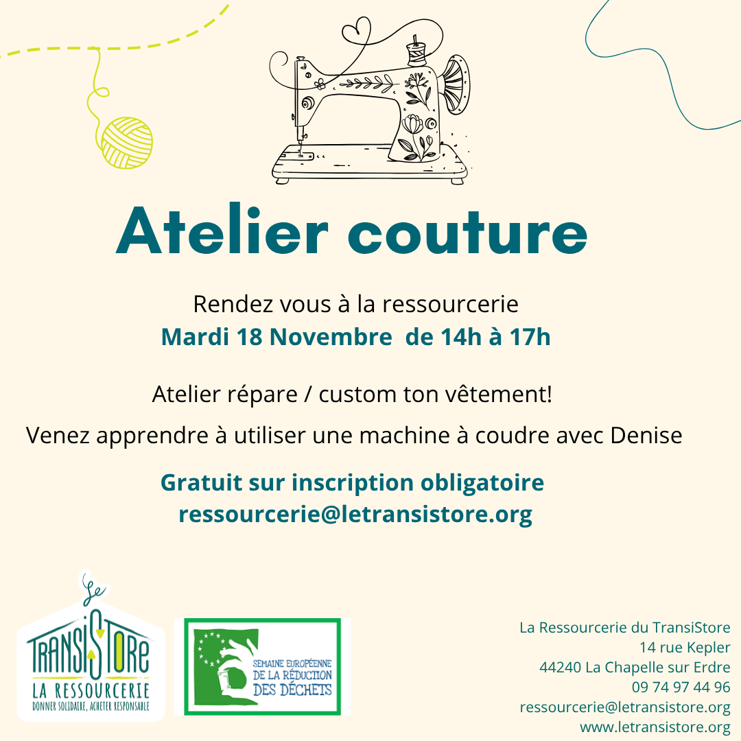 La Ressourcerie du TransiStore organise un atelier couture gratuit animé par Denise le mardi 18 novembre, de 14h à 17h, à la Ressourcerie du TransiStore, 14 rue Képler.