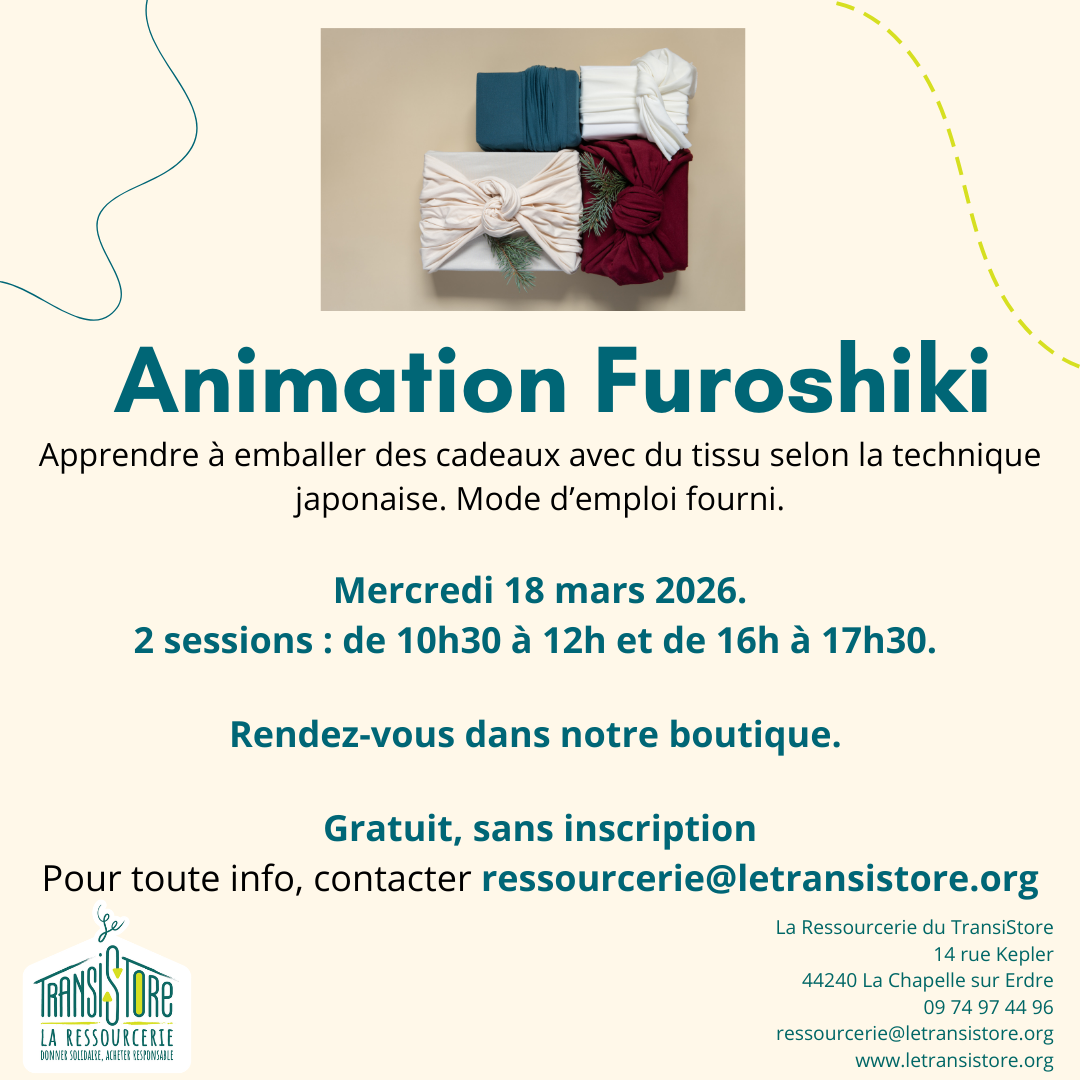 Le TransiStore organise un atelier furoshiki le mercredi 18 mars 2026, de 10h30 à 12h et de 16h à 17h30, à la Ressourcerie du TransiStore, 14 rue Képler.