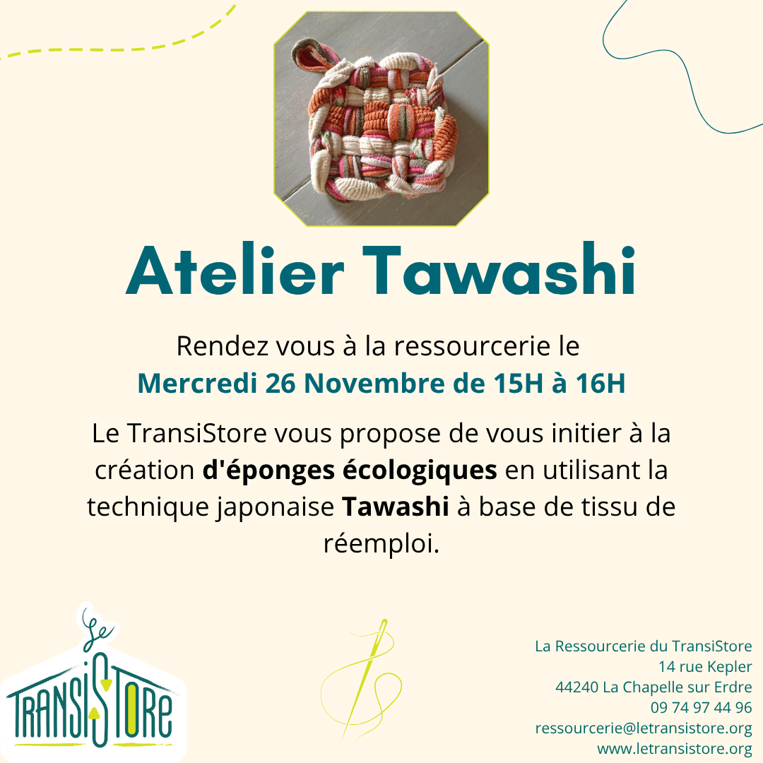 Le TransiStore organise un atelier tawashi le mercedi 26 novembre 2025, de 15h à 16h, à la Ressourcerie du TransiStore, rue Képler.
