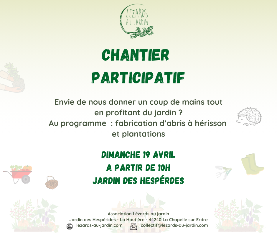 L'association Lézards au jardin organise un chantier participatif le dimanche 19 avril 2026, de 10h à 13h, au Jardin des Hespérides.