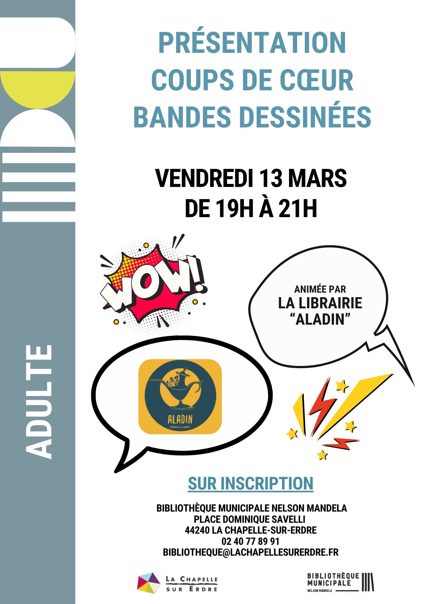 La Bibliothèque Municipale organise une soirée bande dessinée destinée aux adultes le vendredi 13 mars 2026, de 19h à 21h.