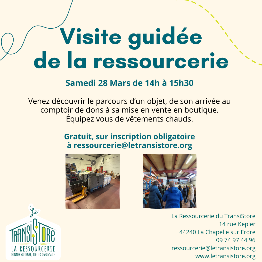 L'association Le TransiStore propose une visite guidée de la Ressourcerie le samedi 28 mars 2026, de 14h à 15h30, au 14 rue Képler.